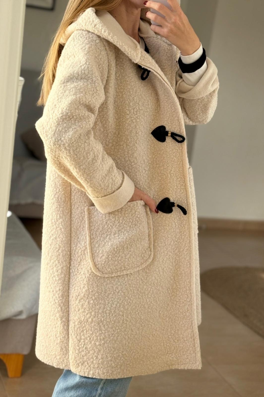 Precioso abrigo mido estilo trenca con capucha, efecto borreguito en color crema. Es un abrigo sin forro, ligero y poco pesado ideal para el entretiempo. Lleva cierres de cuerno en color negro estilo trenca.