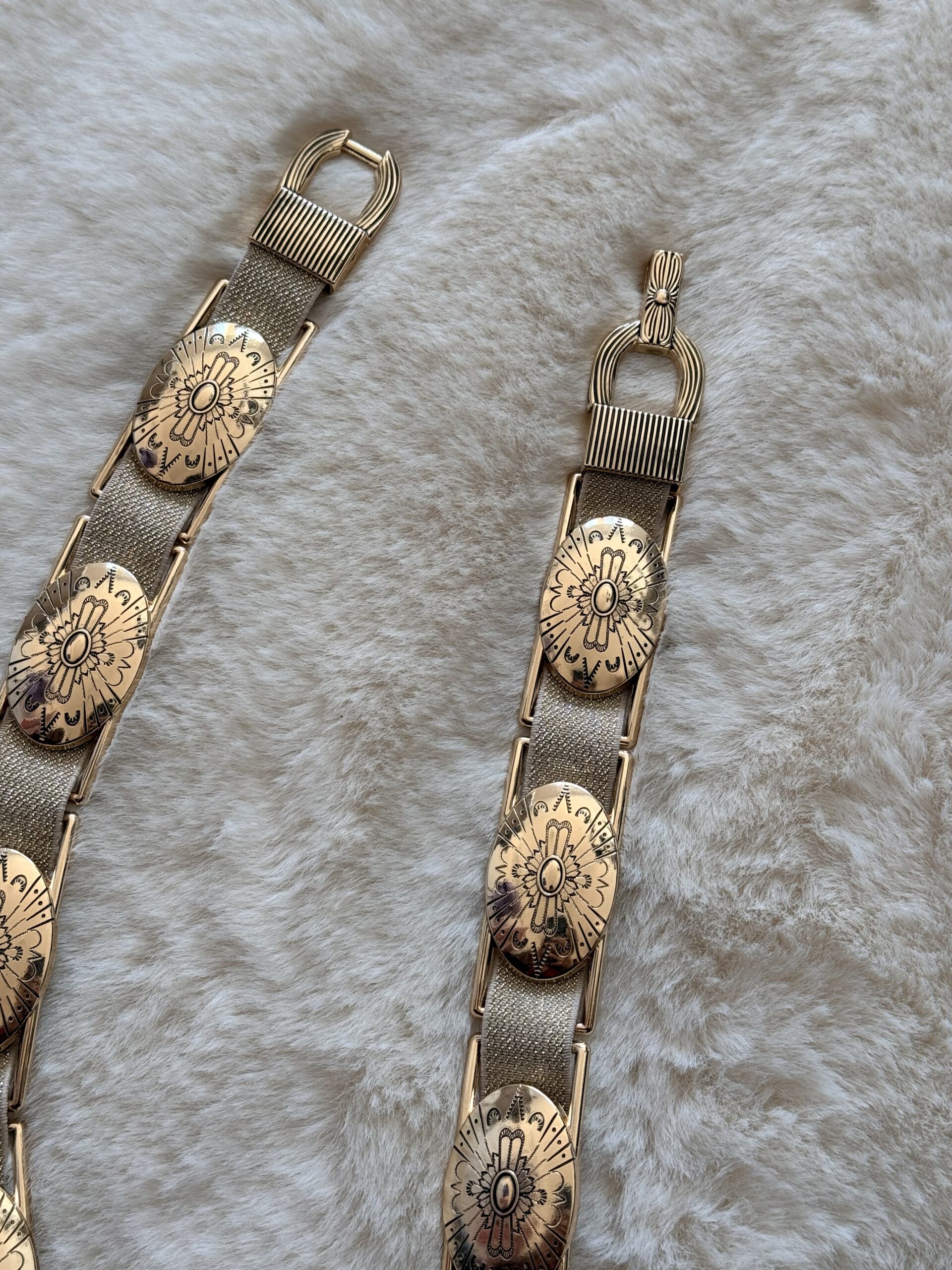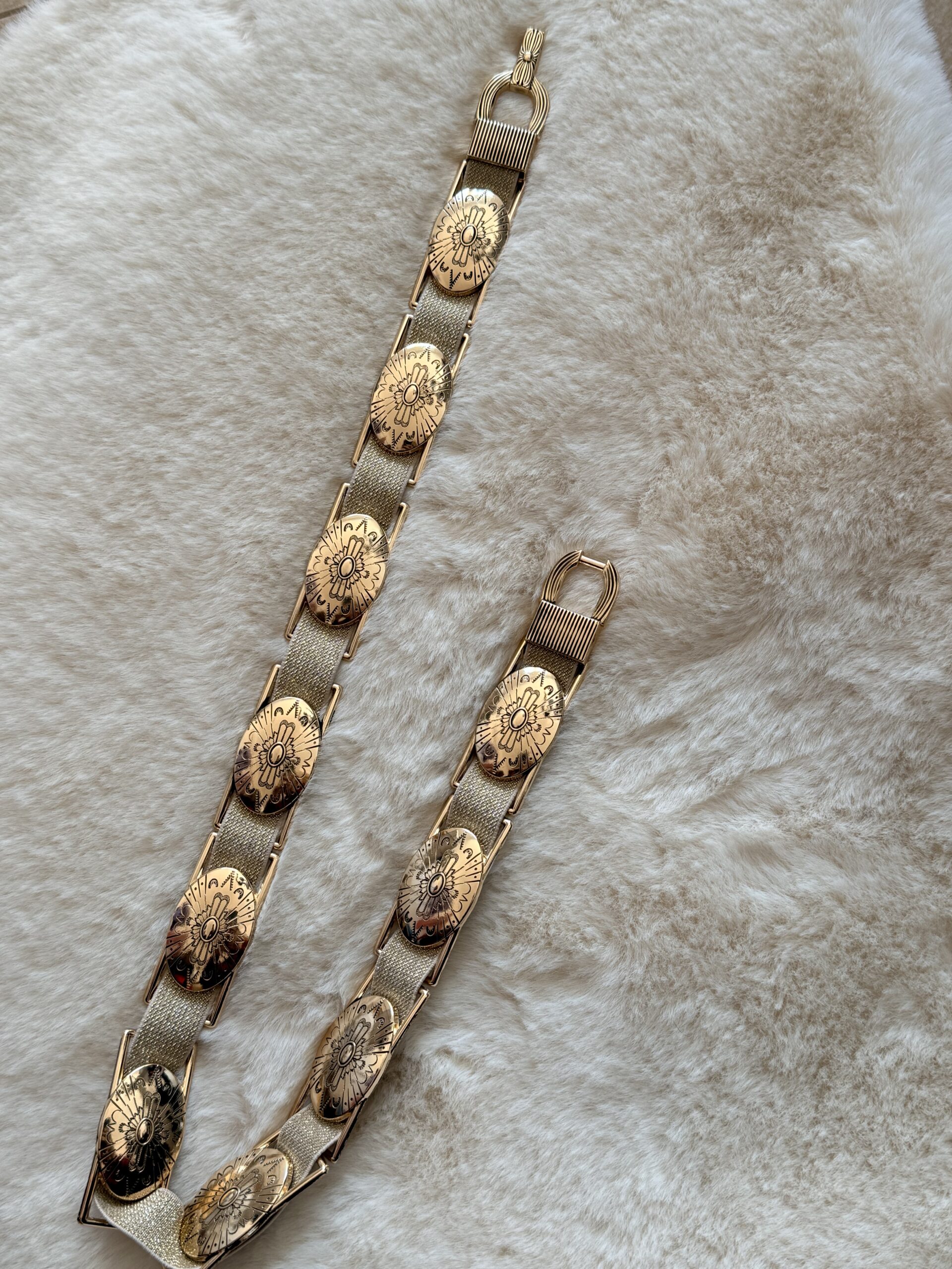 Precioso cinturón metálico dorado que combina engomado elástico para adaptarse genial a tallas de S hasta L-XL. Ideal para tus looks de fiesta, para elevar un pantalón de vestir o un vestido