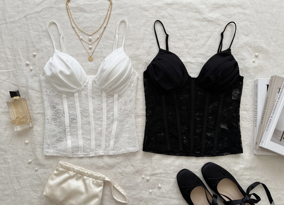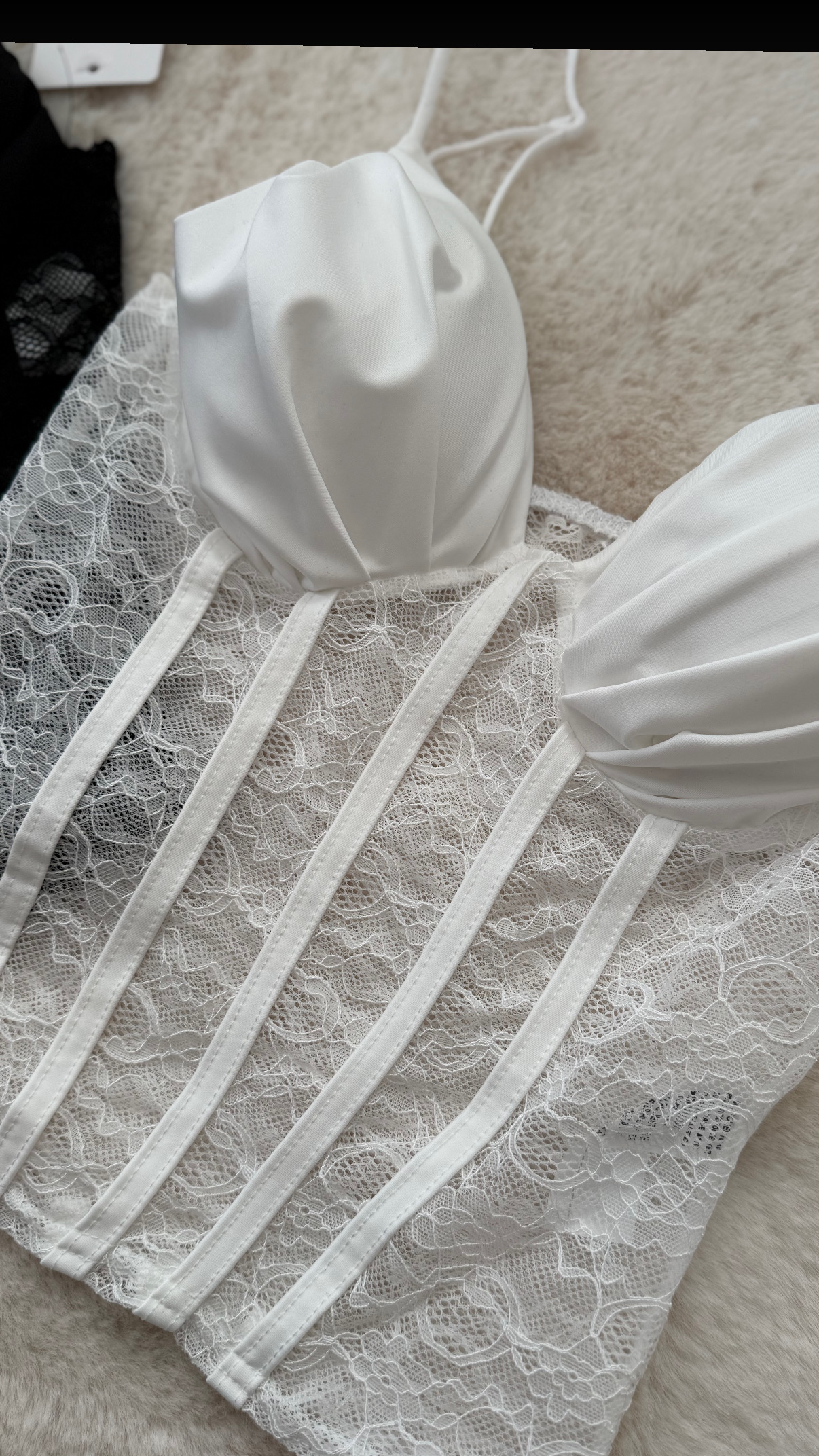 Top elástico de encaje sin cierres (se pone como una camiseta). Un diseño muy cómodo con copas integradas que realzan el pecho y ballenas decorativas para un efecto entallado.