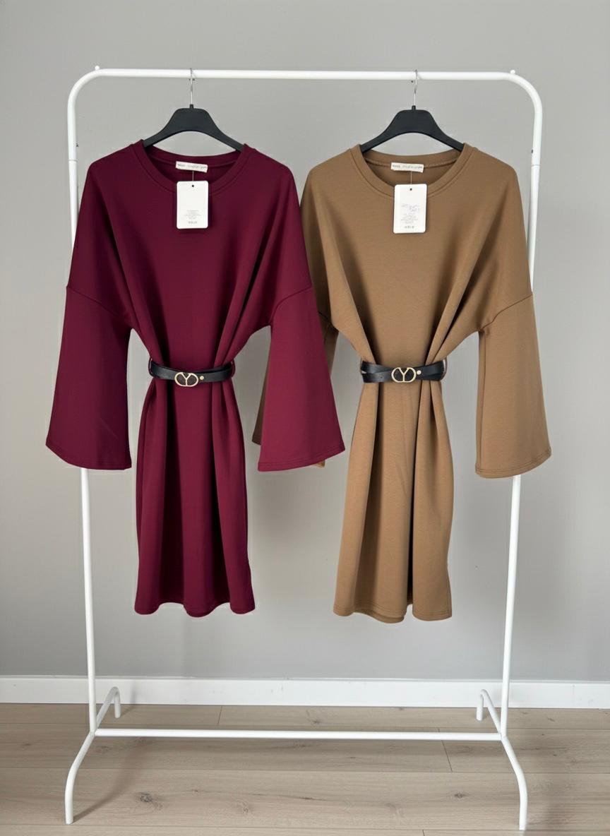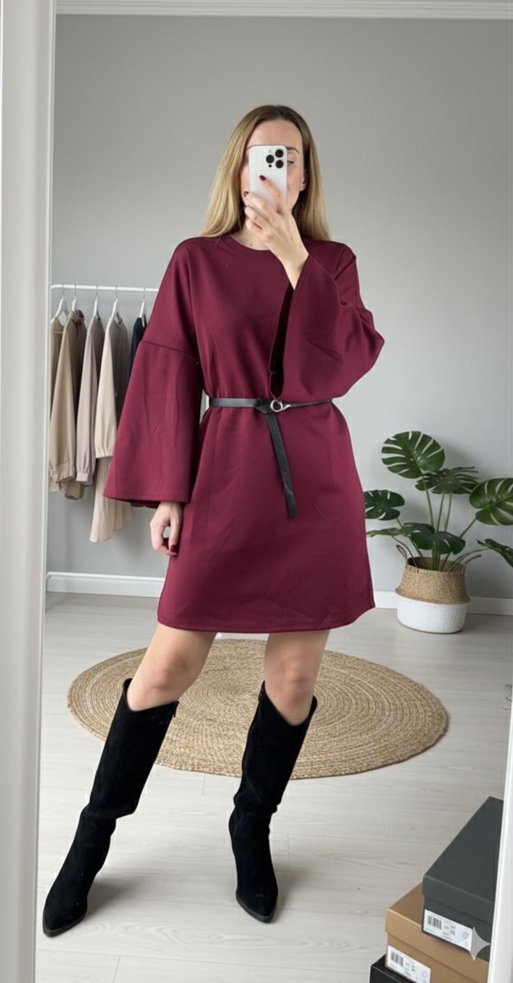 • Detalles: Cuello redondo, manga amplia y cinturón negro con hebilla dorada.